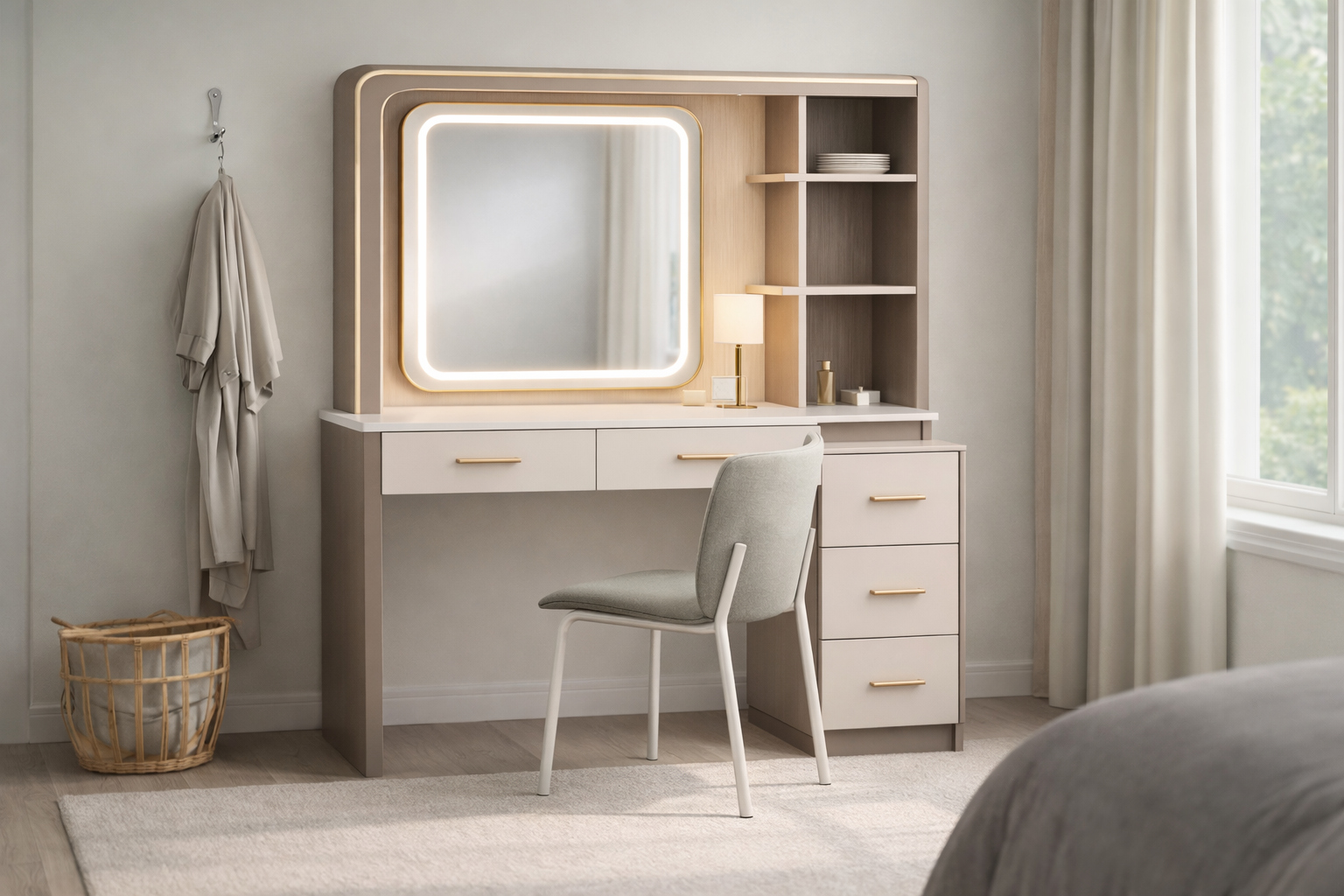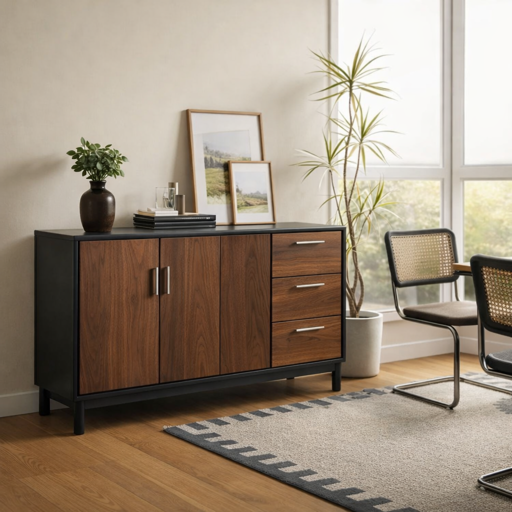 Sideboard für Wohnzimmer oder Essbereich mit funktionaler Aufteilung, bestehend aus mehreren Fächern, Schubladen und Türen, geeignet zur geordneten Aufbewahrung von Geschirr, Textilien und Alltagsgegenständen