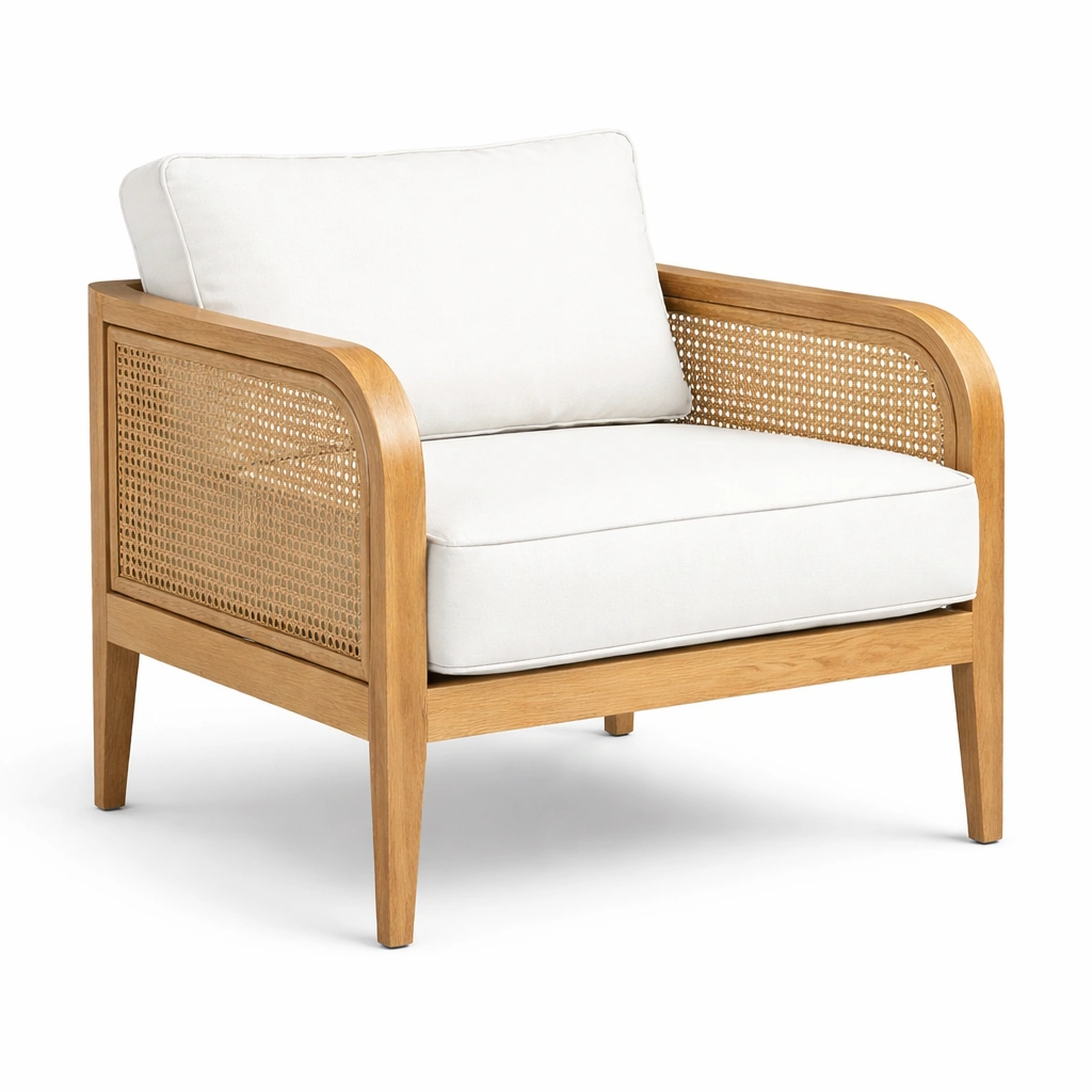 Sessel Holz mit Rattan und Baumwollbezug Creme