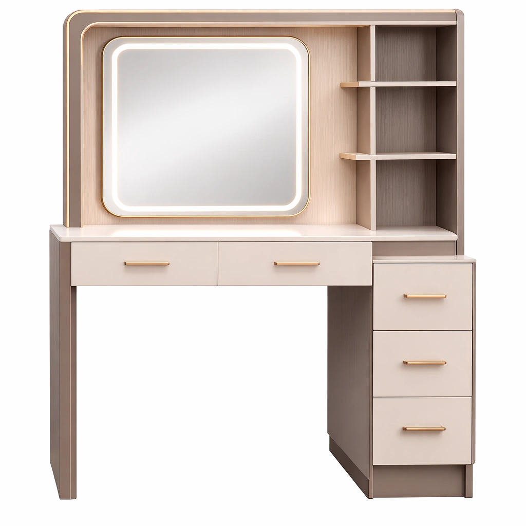 Dieser Schminktisch besteht aus MDF-Holz mit Metallakzenten und bietet viel Stauraum.